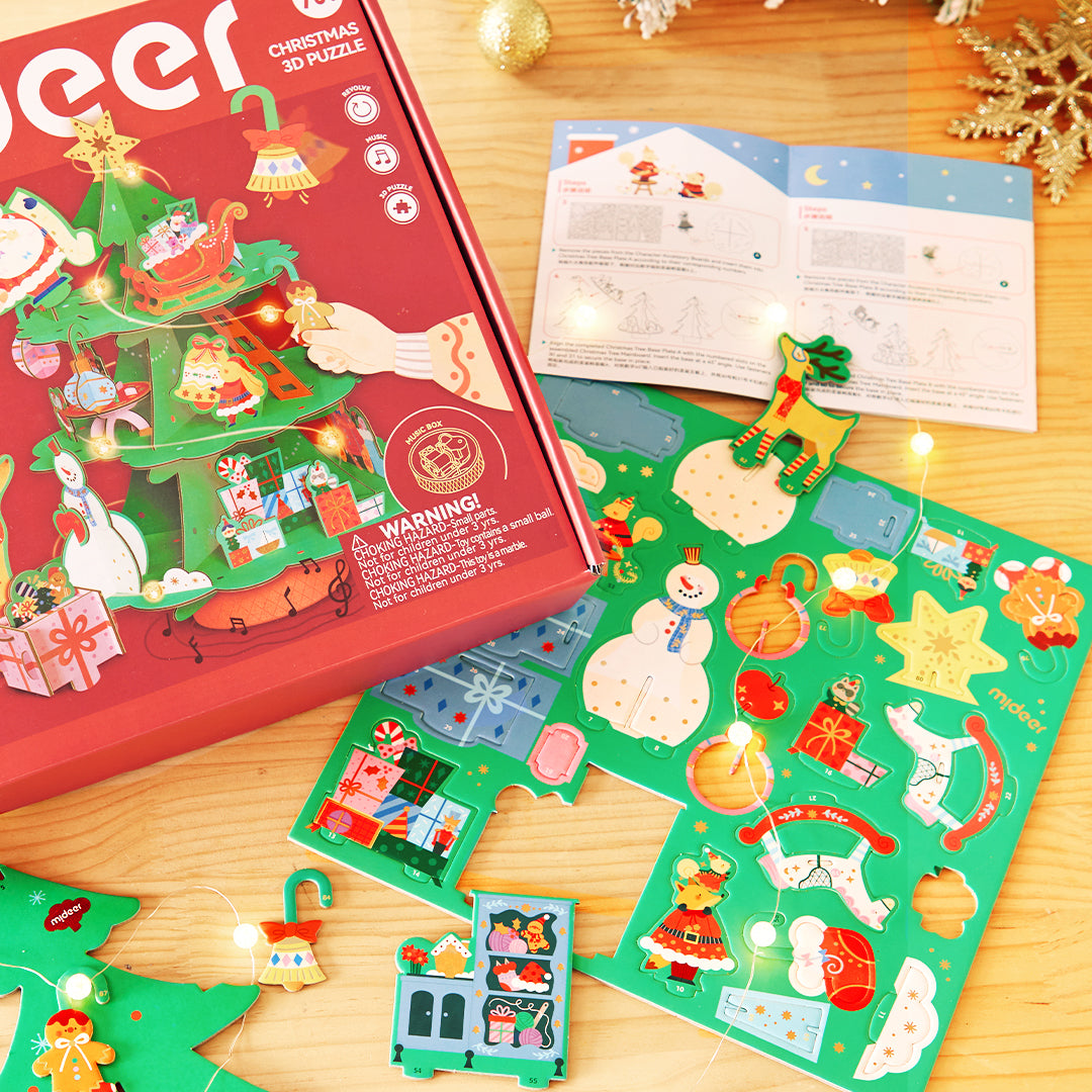 - 包括: 2 圣诞树主板 3 个,圣诞树底座 3 个,人物配件板 2 个,音乐盒底座 1 个,音乐盒 1 个,说明书 1 份,灯珠 1 串